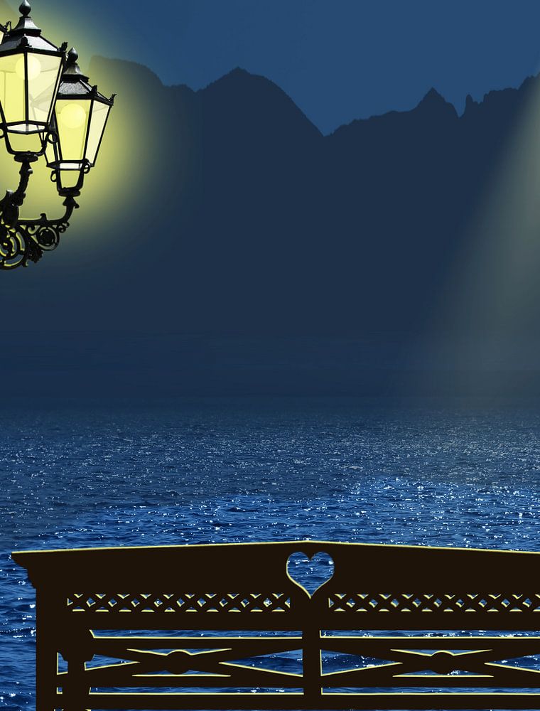 Un patio calme et romantique avec un banc au bord du lac. La lune brille mystiquement sur les montagnes. Une lampe, chat et banc de parc en silhouettes sur fond bleu.