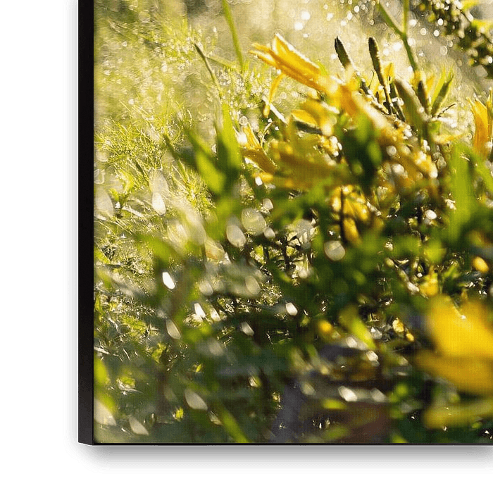 Cette photo vous donne une sensation estivale merveilleuse. L'arroseur qui arrose le jardin, y compris les fleurs jaunes. Le rétro-éclairage et la profondeur de champ choisie donnent des boules de boke, ce qui donne à la photo un effet ludique et spécial.
