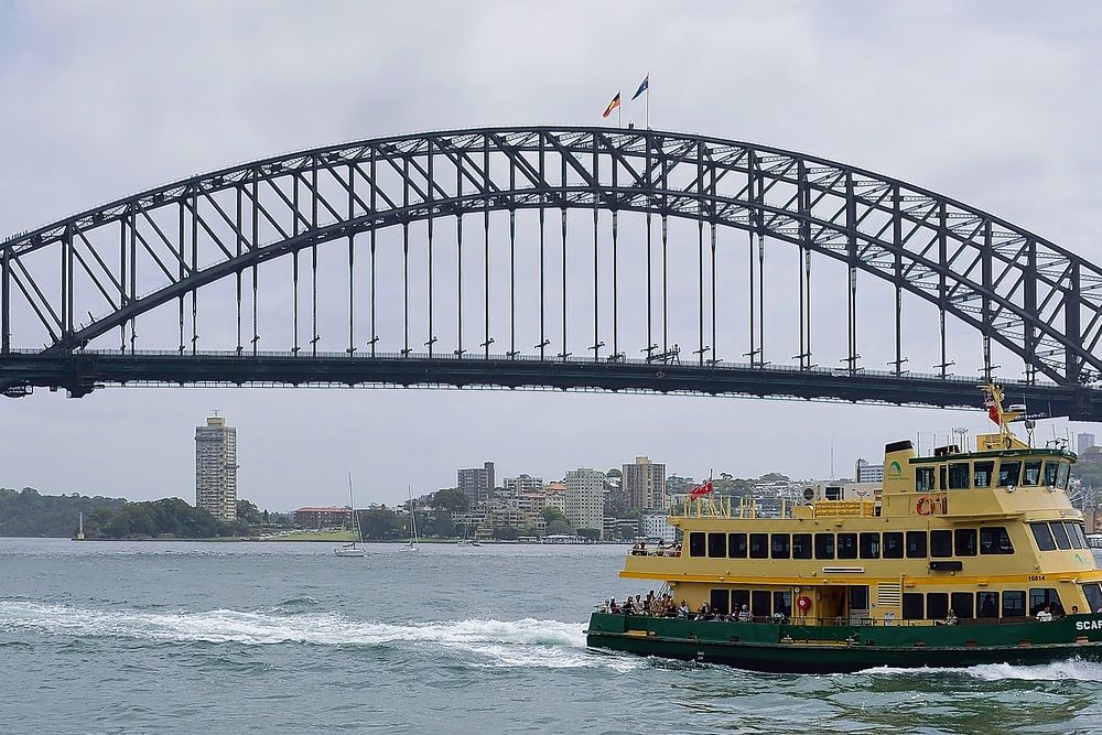 Nous avons passé un excellent moment à l'Opéra de Sydney, en Nouvelle-Galles du Sud, en Australie. L'endroit offre de superbes vues sur le port de Sydney. Ici, un ferry passe devant le Harbour Bridge.