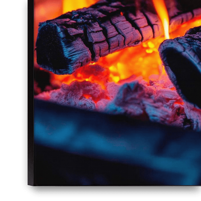 Un spectacle lumineux se déploie au cœur des braises, où des flammes orangées dansent autour de morceaux de bois noueux. Le son sifflant du feu se mêle à la chaleur qui s'échappe des braises, tandis que les profondes écorces noires racontent le jeu des éléments. Il se crée ici une atmosphère magique de convivialité et de joie de vivre.