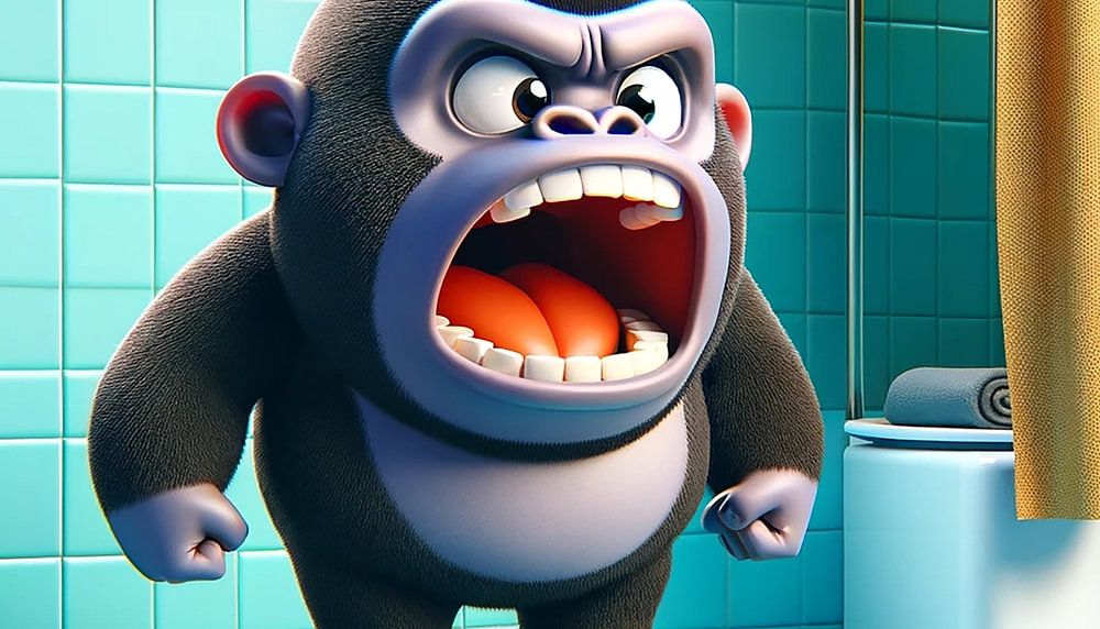 Un gorille effrayé se tient sur une balance de salle de bain et réagit au résultat affiché en poussant un cri horrifié. Le contraste entre le doux silence matinal de la salle de bain et sa réaction violente est représenté avec humour. Autour de lui, des grains de café éparpillés et un gobelet de café renversé indiquent que la routine matinale a été soudainement interrompue. Le gorille, qui lutte manifestement contre son poids, transmet un sentiment trop humain que beaucoup peuvent comprendre, et offre une perspective amusante sur les luttes quotidiennes avec l'image corporelle et l'acceptation de soi.