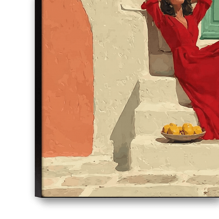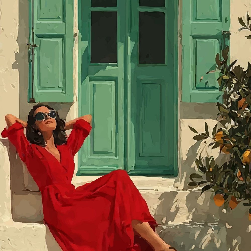Une femme vêtue d'une robe rouge fluide se détend sur des marches en pierre baignées de soleil, encadrée par des volets d'un vert éclatant et un pot en terre cuite débordant de citrons brillants.