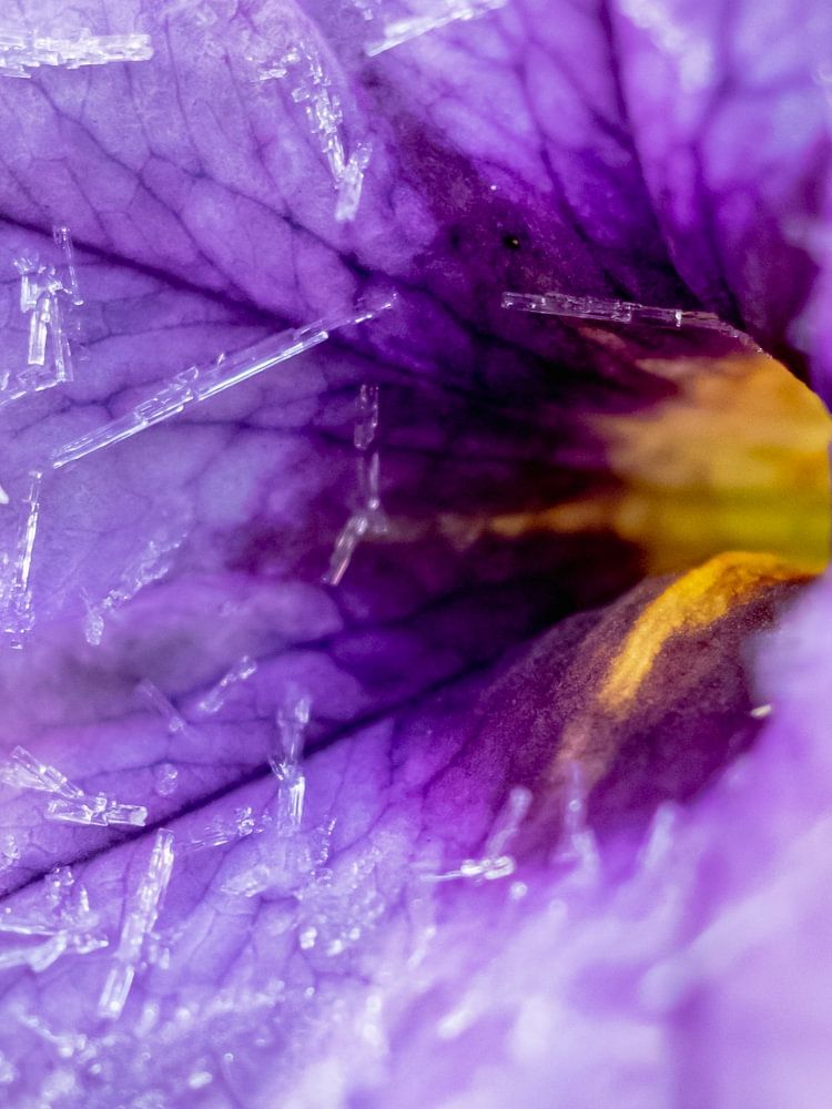 Cette fleur de pétunia était magnifique le matin après la première gelée nocturne de l'année. Les cristaux de glace sont bien visibles et la fleur se détache joliment sur le fond vert. Cette photo a été prise avec un objectif macro à l'ancienne.