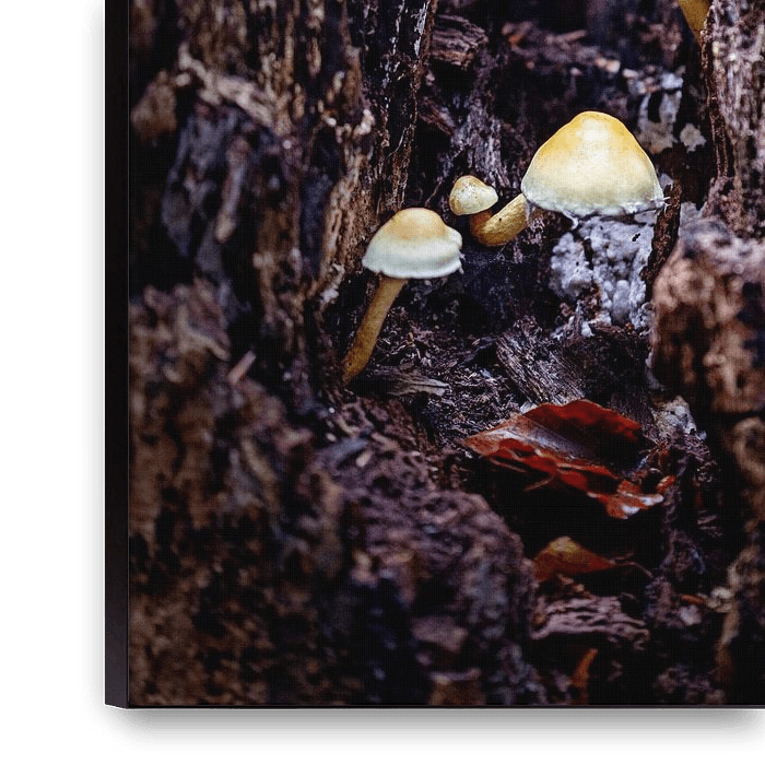 Achetez cette photo Un groupe de champignons dans une crevasse d'un arbre en décomposition par Hans de Waay sur toile, aluminium, ArtFrame ou photographie (encadrée), impression d'art en haute qualité et tout format.