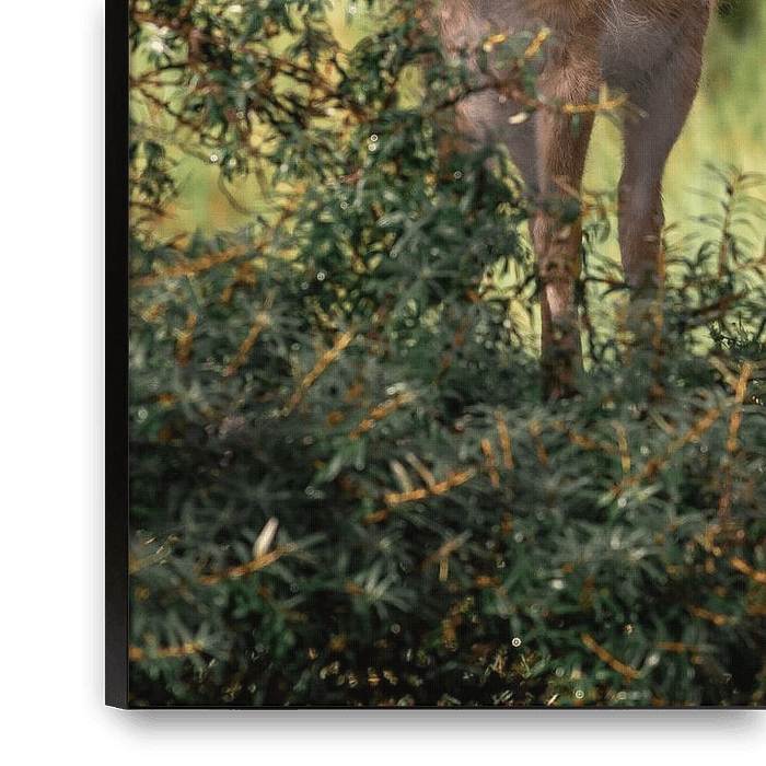 Achetez cette œuvre d'art de paysage Un jeune chevreuil regarde curieusement à travers les buissons. par Jolanda Aalbers sur toile, aluminium, ArtFrame ou photographie (encadrée), impression d'art en haute qualité et tout format.