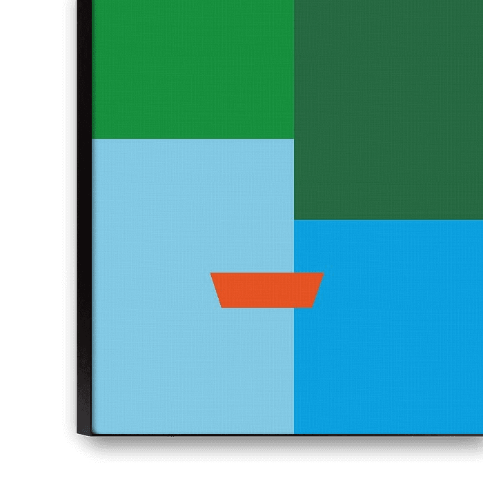 Cette impression graphique représente le paysage serein d'un lac, encadré par deux montagnes majestueuses en arrière-plan. L'image est composée de formes géométriques claires qui représentent l'eau, les montagnes et le bateau de manière stylisée. L'utilisation de couleurs vives crée un contraste dynamique, permettant à chaque élément de ressortir avec force tout en dégageant un sentiment de calme et de simplicité.