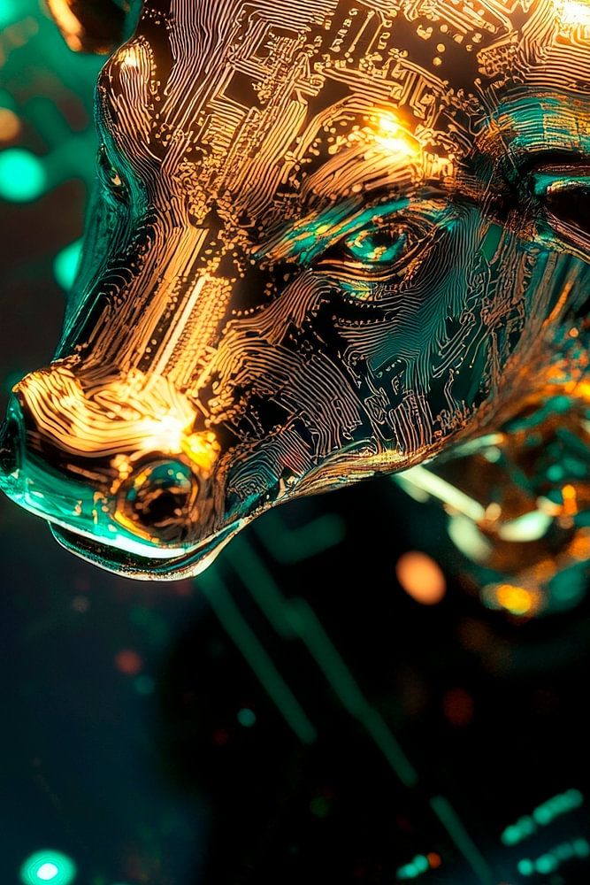 Un majestueux taureau doré, plein d'énergie et de puissance, met en valeur le bitcoin et symbolise avec force l'ascension et le potentiel de la cryptomonnaie. Les lignes lumineuses et futuristes en arrière-plan ajoutent une touche de modernité à l'image. Parfaitement adapté à un bureau, il inspire de nouvelles idées et perspectives !