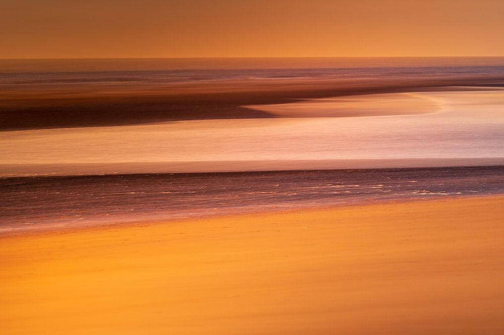 Un coucher de soleil doré sur la Côte d'Opale au début du printemps. Les plages sont encore vides, il n'y a que le soleil, la mer et moi. Grâce à la technique ICM utilisée (mouvement Intentional Camera Movement, traduit en néerlandais, cela signifie que l'appareil photo a été délibérément (Intentional) déplacé pendant la prise de vue), le coucher de soleil doré est magnifiquement doux mais fermement capturé, presque rêveur et abstrait à la fois.