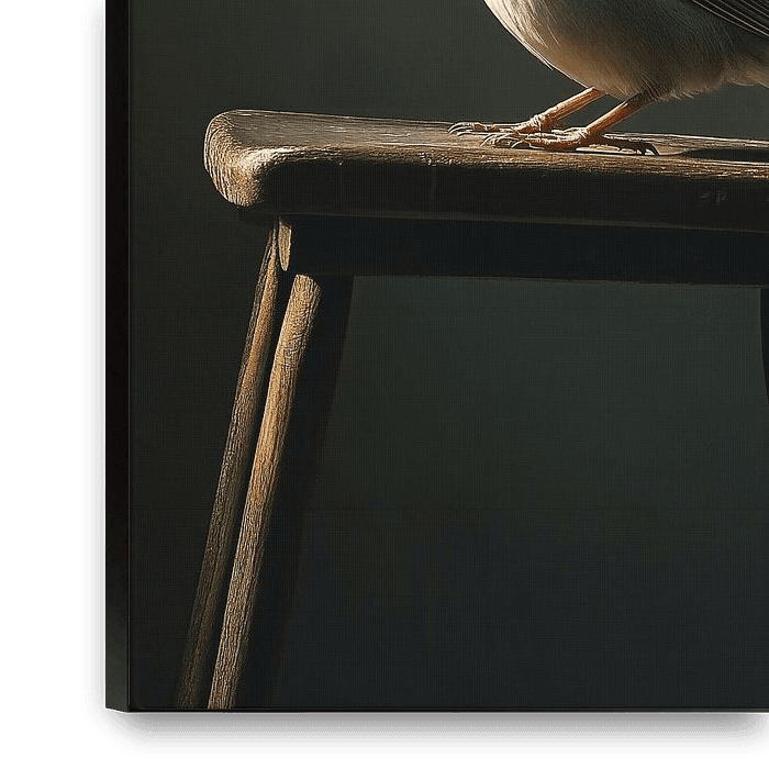 Dans une pièce sereine et tranquille, où le temps semble s'être arrêté, un minuscule moineau domestique est tranquillement assis sur le bord d'une simple chaise en bois. Sa silhouette délicate est mise en valeur par un doux rayon de lumière tombant à travers une étroite ouverture. La lumière chaude et dorée embrasse ses plumes délicates, révélant une palette harmonieuse de tons de terre : les tons bruns subtils de son dos, les tons chauds rouge rouille de sa tête et la blancheur douce et presque soyeuse de sa poitrine.