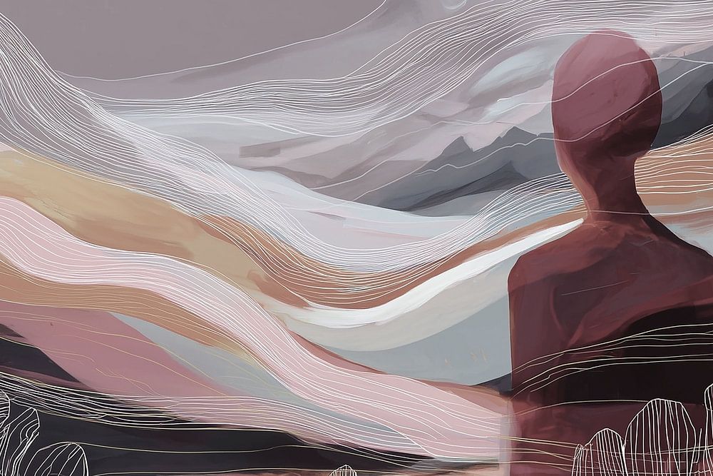 Moment of Reflection montre un jeu feutré entre l'homme et le paysage, dans lequel une silhouette se fond, de dos, dans les formes stratifiées des collines et des vallées. La figure n'est pas séparée de son environnement, elle semble faire corps avec la terre qui l'entoure. Sa présence est silencieuse, presque transparente, comme si elle était façonnée par les mêmes lignes et courants que le paysage lui-même.