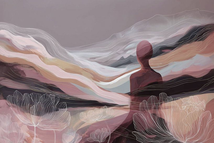 La lumière s'ouvre subtilement autour de la figure, comme si le paysage reconnaissait sa présence et l'embrassait. Le regard du spectateur n'est pas guidé par les détails d'un visage ou d'une expression, mais par le jeu serein de la silhouette, des lignes et des couleurs. L'œuvre vous invite à prendre un moment d'attention, à respirer profondément et à faire l'expérience du calme en vous-même et dans votre environnement.