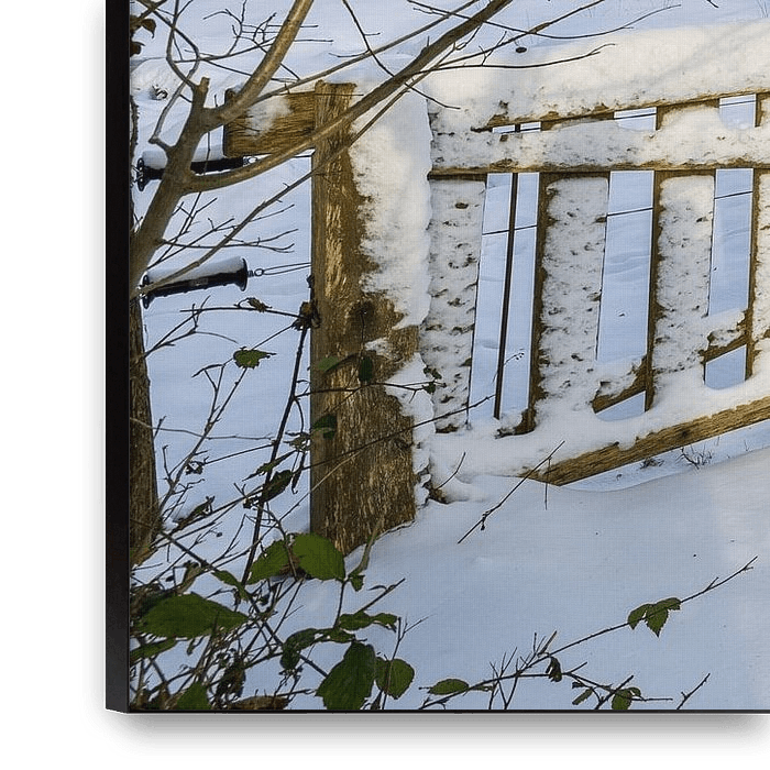 Dans ce paysage d'hiver, le monde est recouvert d'une douce couche de neige. Au premier plan, un portail en bois est légèrement ouvert. Des traces sont visibles dans la neige : un animal vient de la franchir. Ce petit mouvement donne de la vie à l'image fixe.