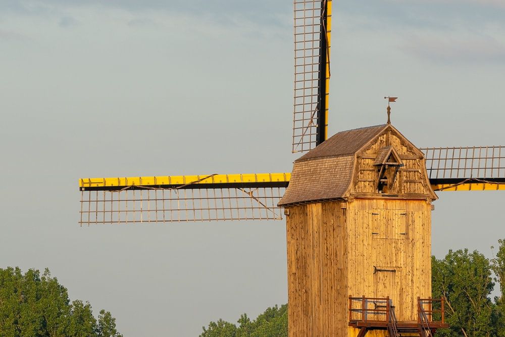Tôt le matin, il y a un beau moulin à vent avec le soleil qui se lève dans le ciel.