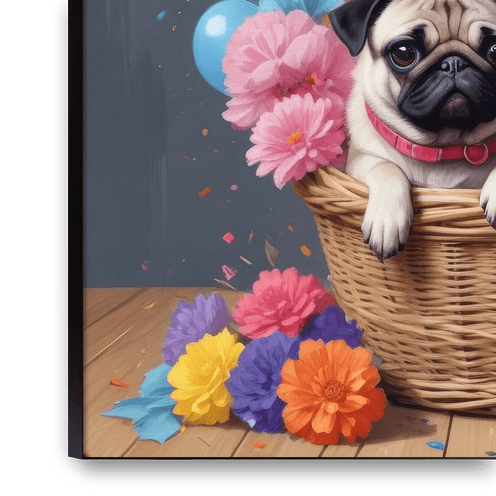 Trois adorables carlins sont assis dans un panier en osier débordant de fleurs colorées. Un joyeux bouquet de ballons de différentes couleurs flotte au-dessus d'eux, ajoutant à l'atmosphère festive. Les carlins, qui portent tous un collier rouge, regardent directement le spectateur avec leurs expressions si attachantes.