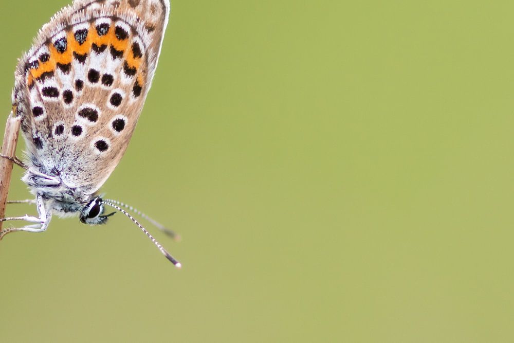 Ce papillon bleu de bruyère est assis tranquillement sur un esprit qui se réchauffe dans la lumière du matin. La couleur orange du dessous des ailes est un joli contraste avec le vert de l'herbe en arrière-plan.