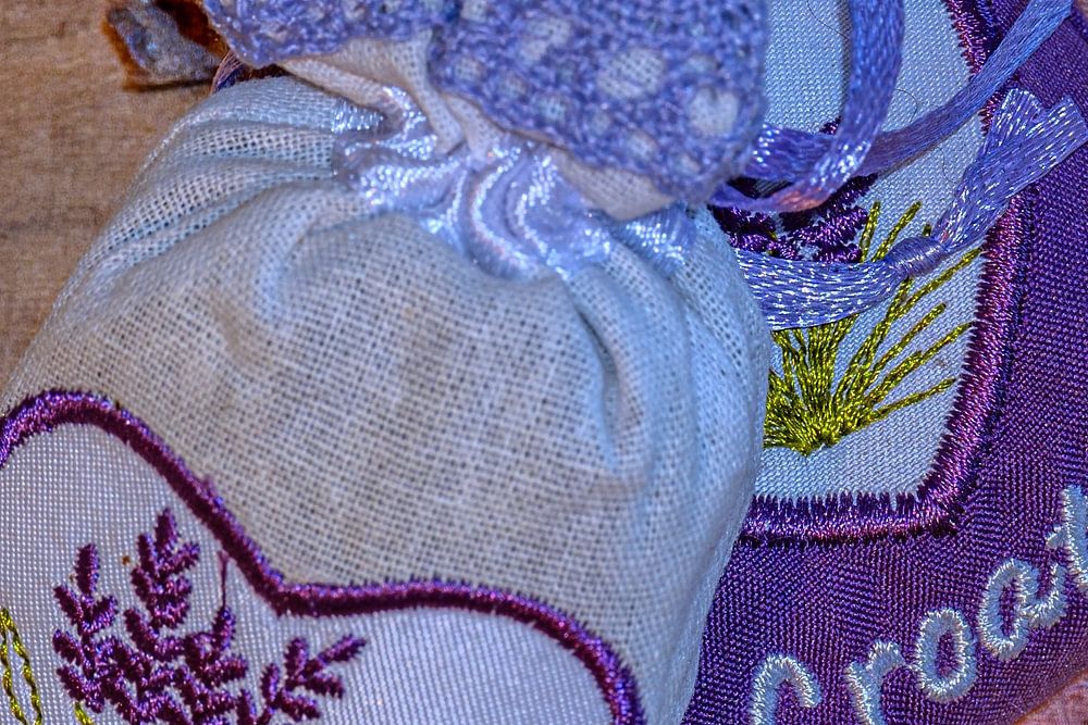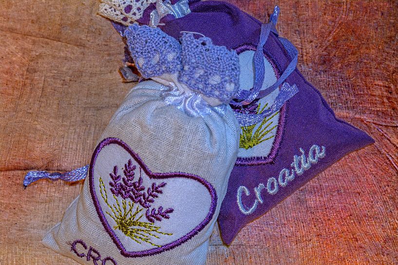 Deux petits sacs en tissu brodés avec soin reposent sur un fond rustique, imprégnés du parfum des champs de lavande croates. De délicates dentelles et des cœurs violets ornent le lin, tandis que l'inscription « Croatia » réveille de lointains souvenirs de vacances.