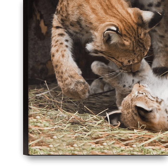 Achetez cette photo Un petit chaton lynx très mignon, couché sur le dos et jouant avec sa mère - un énorme chat, un fond par Michael Semenov sur toile, aluminium, ArtFrame ou photographie (encadrée), impression d'art en haute qualité et tout format.