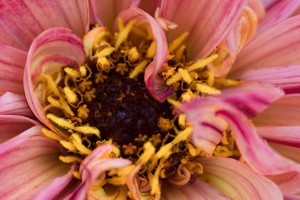 Une macro image d'un dahlia rose avec un "cœur en désordre".