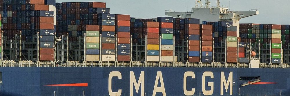 Le mur de conteneurs transportés par l'énorme porte-conteneurs. Sous le soleil de fin d'après-midi. Le remorqueur qui navigue vers le navire pour lui porter assistance. La côte de Hoek van Holland en arrière-plan. Photographié depuis la Maasvlakte.