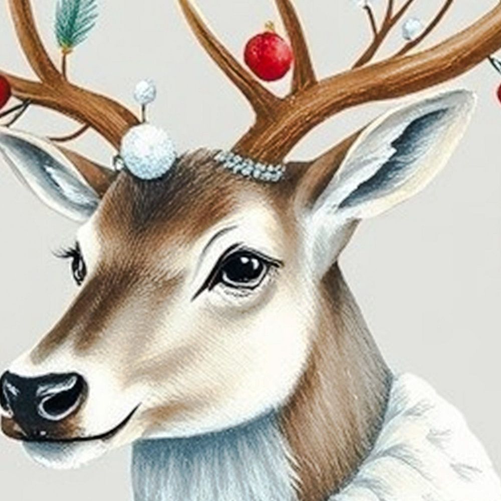 Illustration d'un renne brun et blanc avec des décorations de Noël autour de ses bois et une chaîne argentée. Il porte un large collier blanc bleu tendre dans des couleurs pastel douces et calmes sur un fond beige clair.