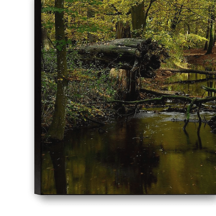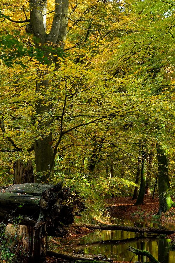 J'ai pris cette photo dans le Leuvenumse bos à la limite de la commune de Nunspeet et de la commune de Harderwijk. Le ruisseau que vous voyez est le Hierdensche beek qui est aussi appelé le Leuvenumse beek. Les couleurs automnales des arbres montrent que j'ai pris cette photo en automne. Les jours précédents, il avait plu et le niveau de l'eau dans le ruisseau était plus élevé. Les branches que l'on dépose dans le ruisseau font monter encore plus le niveau de l'eau dans le ruisseau. J'ai choisi de prendre cette photo debout afin de souligner la hauteur des arbres et de mieux voir les couleurs d'automne sur les arbres.