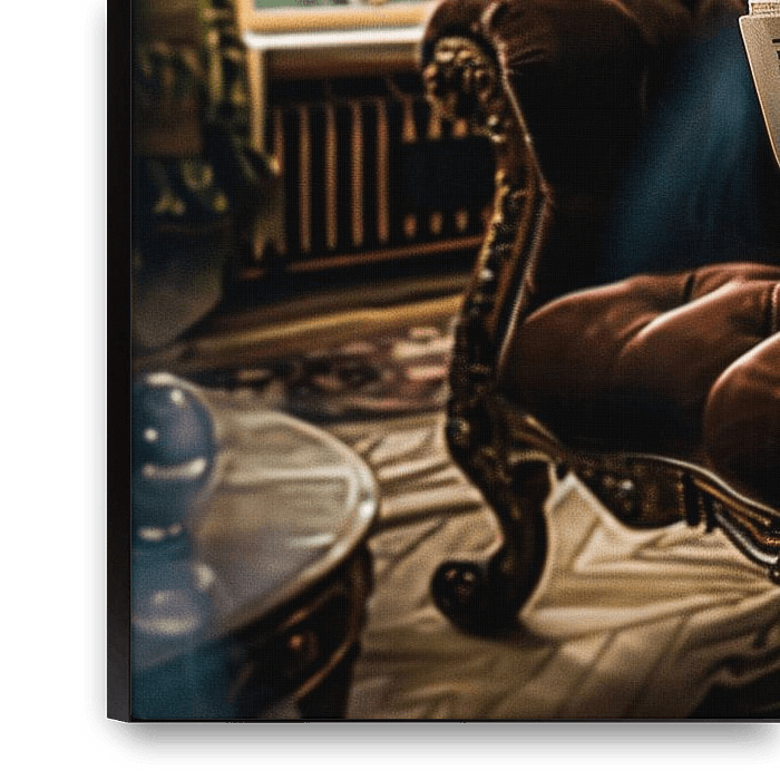 Ce dessin unique représente un serpent élégant dans un cadre classique. Le serpent porte un haut-de-forme élégant et fume la pipe, tout en se relaxant en lisant un journal. La scène dégage une atmosphère raffinée et excentrique qui s'intègre parfaitement dans un intérieur luxueux. La riche palette de couleurs marron et or met en valeur…