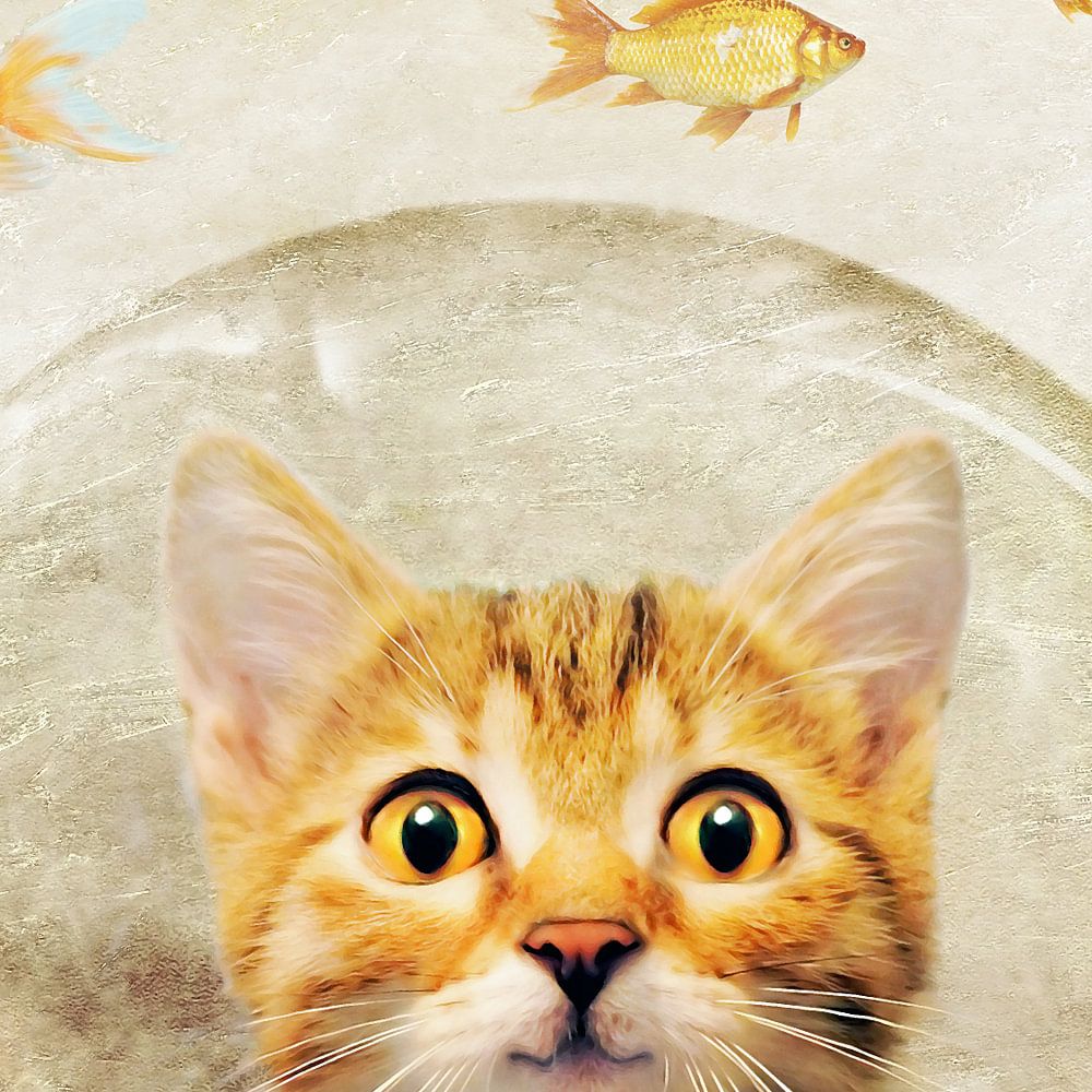 Médias mixtes, peinture numérique avec un chaton dans un aquarium et le poisson qui vole librement dans les airs. Vous avez eu une de ces journées ;-)