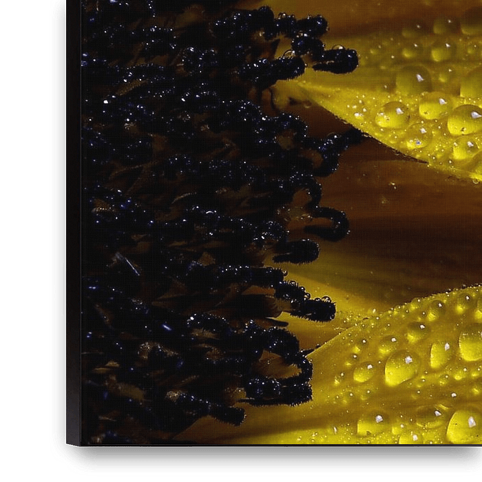 Ce magnifique tournesol est juste un peu différent, les belles gouttes et la découpe spéciale se démarqueront sûrement dans n'importe quel espace.