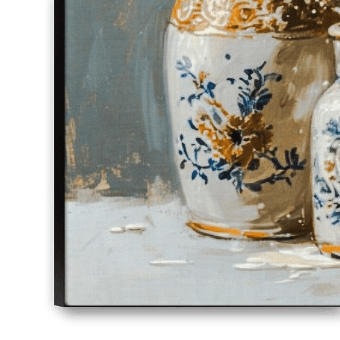 vases et bouteilles de lait bleu delft vases en poterie de verre or avec des bulles de lait éclaboussantes sur un fond blanc gris foncé clair dans des couleurs de peinture faisant allusion au nouveau style des anciens maîtres hollandais.