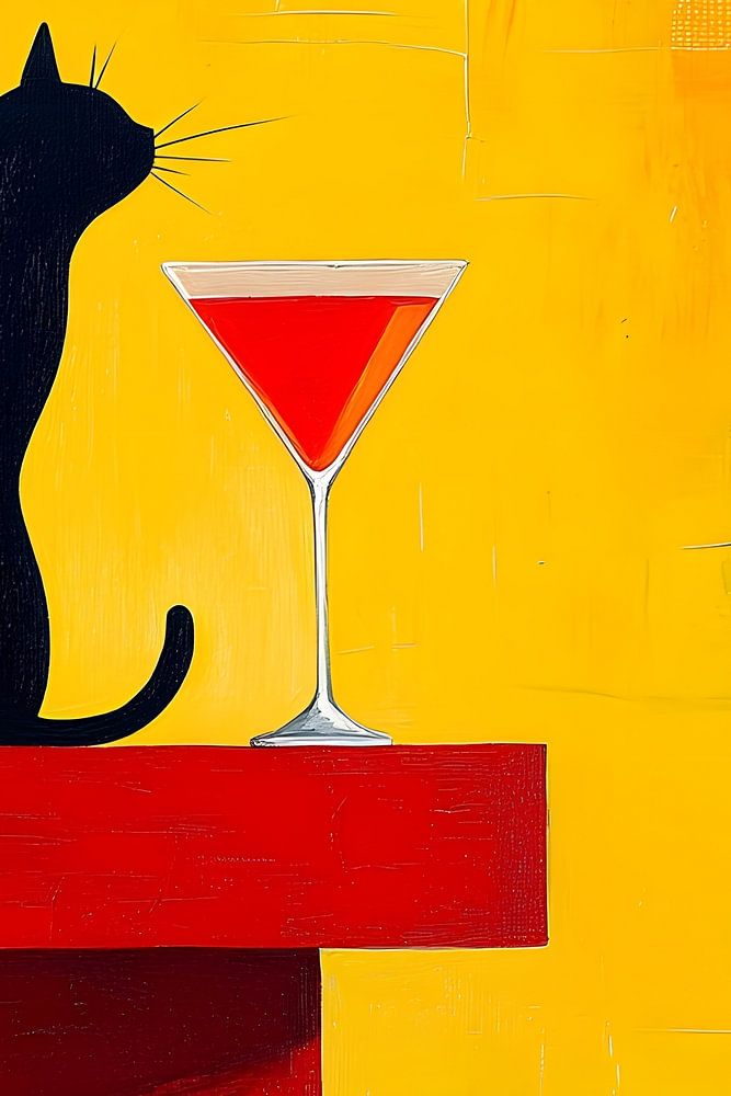 Dans cette illustration minimaliste, nous voyons un charmant chat assis nonchalamment sur le comptoir d'un bar. Son pelage est d'un noir intense, ce qui lui confère un look élégant et moderne. Le chat a une expression curieuse sur son visage, tandis qu'il renifle avec espièglerie un verre à cocktail posé devant lui.