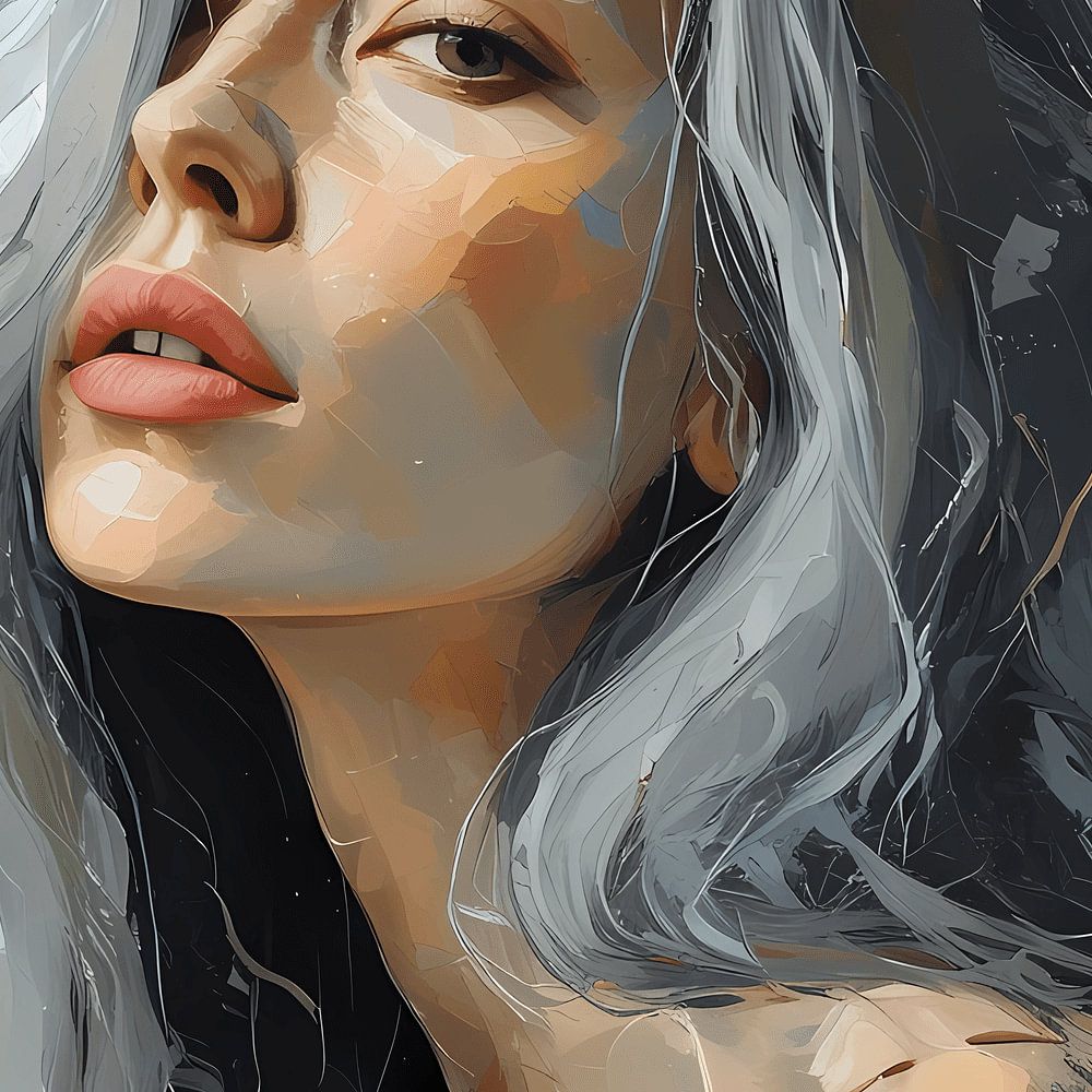 La peinture abstraite d'une femme de 40 ans aux cheveux gris évoque un sentiment de force, d'expérience et d'introspection. La femme n'est pas représentée en détail, mais sa présence est ressentie à travers les choix subtils de couleurs et de textures. Les cheveux gris sont représentés par des lignes fluides et asymétriques, le contraste entre les nuances de gris et les couleurs douces et sourdes telles que le bleu, le taupe et la lavande créant un aspect à la fois calme et stratifié.