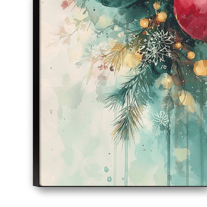 Acheter ce illustration Une aquarelle représentant des décorations de Noël aux douces nuances turquoise et rose chaud, entourées de branches de pin et de lumières dorées. La technique fluide de l'aquarelle crée une interprétation moderne et onirique des décorations de Noël classiques, où les couleurs se fondent subtilement sur un fond clair de délicats flocons de neige. par Studio BB sur toile, aluminium, ArtFrame ou photographie (encadrée), impression d'art en haute qualité et tout format.