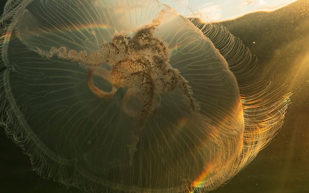 Les méduses n'ont pas une très bonne réputation, mais sous l'eau, on se rend compte qu'elles sont vraiment très belles ! J'ai rencontré cette méduse alors que je faisais de la plongée libre dans le Veerse Meer, en Zélande. La lumière du soir créait une atmosphère fantastique. Pour d'autres photos du lac Veere, voir : https://naturebylennart.com/view-below-the-surface-blog/underwater-photography-in-the-veerse-meer/.