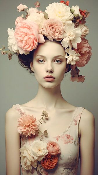 Portrait de style vintage d'une jeune femme parée de fleurs de couleurs pastel. Une ode à la féminité et au printemps au travers de ces couleurs douces et d'une beauté sans frontière.