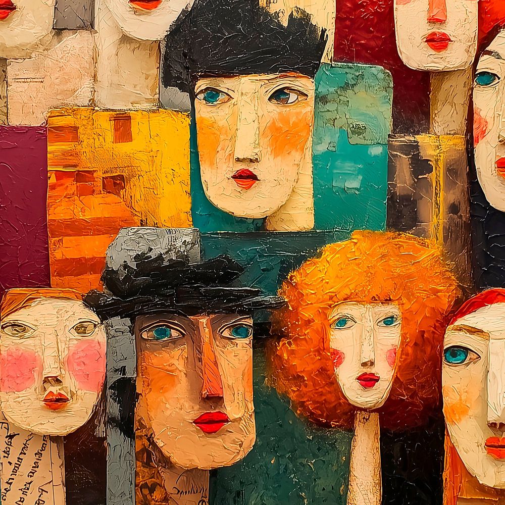 Une peinture abstraite vibrante présentant un collage de visages humains stylisés avec diverses caractéristiques et expressions faciales exagérées. Chaque visage présente des Chaque visage présente des motifs détaillés et des éléments de texture qui ajoutent de la profondeur à l'œuvre d'art et contribuent à un sentiment d'unité et de…