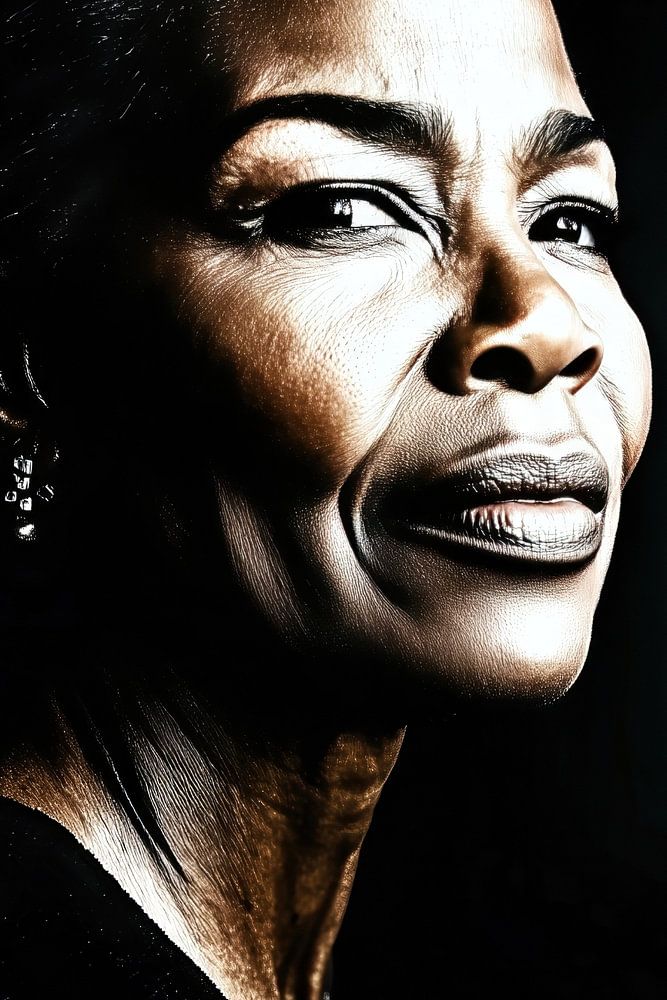 Ce portrait impressionnant montre une élégante femme noire âgée, vêtue de vêtements sombres et de bijoux élégants, assise devant un fond sombre et enveloppée d'une douce lumière. La subtilité de la lumière souligne les traits de son visage d'une manière délicate mais puissante et fait ressortir la profondeur de son rayonnement.