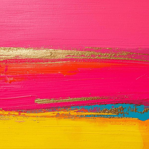 Une explosion audacieuse de rose vif et de jaune chaud, entrecoupée de puissantes touches d'orange et de subtiles lignes dorées. La peinture semble presque bouger sur la toile, comme si l'on pouvait encore sentir le moment où elle a été appliquée. Cette œuvre dégage énergie et audace et attire immédiatement l'attention dans n'importe…