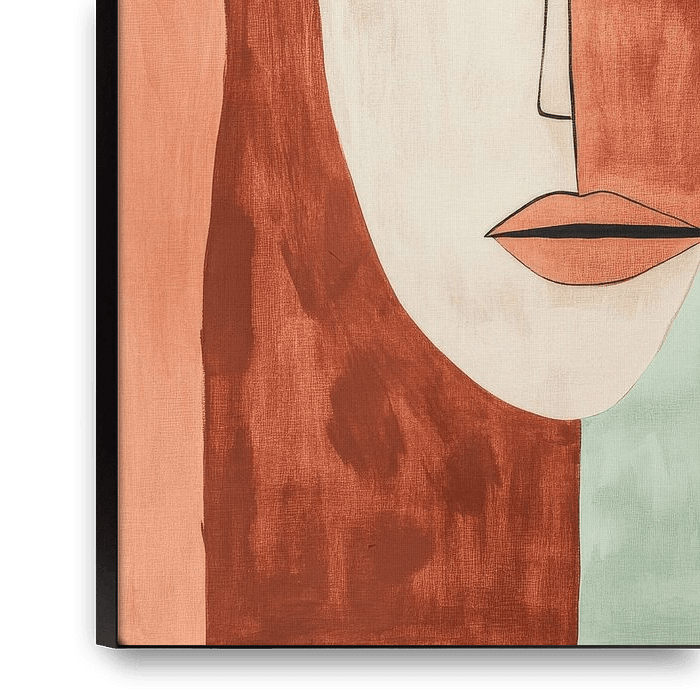 Woman in Silence" montre un visage féminin stylisé aux yeux fermés, à moitié dissimulé dans des tons chauds de terre et de vert menthe. Les lignes minimalistes et les blocs de couleur transmettent un sentiment de calme, d'introspection et de douce mélancolie. Cette composition combine abstraction et figuration dans un équilibre…