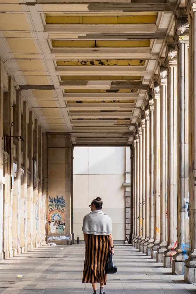 L'image montre une personne marchant seule dans une colonnade monumentale. La perspective souligne la longue rangée de colonnes classiques et le rythme du plafond. La personne, vêtue d'un haut blanc et d'une longue jupe rayée, porte un sac et se dirige vers la lumière au bout de la galerie. Des graffitis sur les murs à gauche et quelques colonnes à droite contrastent avec l'architecture majestueuse et historique. L'ensemble donne une impression de tranquillité, de profondeur et d'intemporalité.