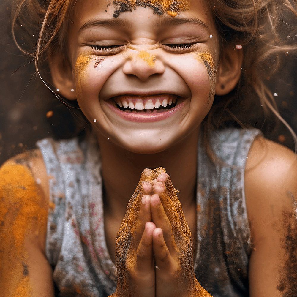 Cette jeune fille rayonne de joie : quoi de mieux pour un jeune enfant que de se salir et de se parer des couleurs les plus folles. C'est à juste titre que l'on peut parler de fête de la poudre.