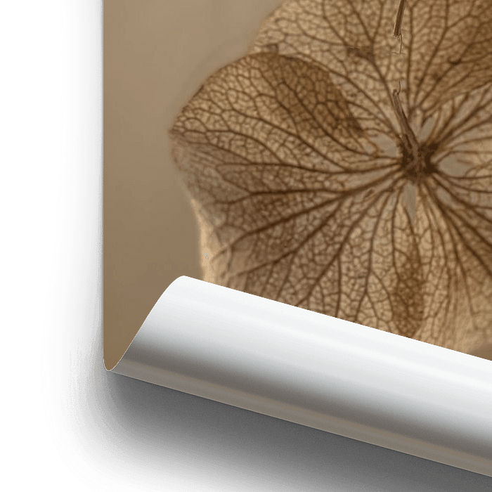 "Une feuille d'hortensia avec une image miroir dans les tons de brun" est une photo macro d'une feuille d'hortensia qui a déjà partiellement pourri, ce qui permet de voir magnifiquement la structure des veines de la feuille. Si vous zoomez sur l'œuvre, vous pouvez bien voir la structure des nervures sur les deux feuilles supérieures.…