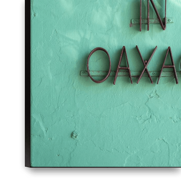 Un mur vert menthe avec une bordure jaune frappante sert de toile de fond à un message puissant : "Une fois à Oaxaca". Équilibrant la typographie, la texture et la couleur, cette image évoque l'atmosphère d'un lieu où l'on a été, ou que l'on voudrait être un jour. Idéale pour ceux qui aiment les photographies graphiquement fortes avec…