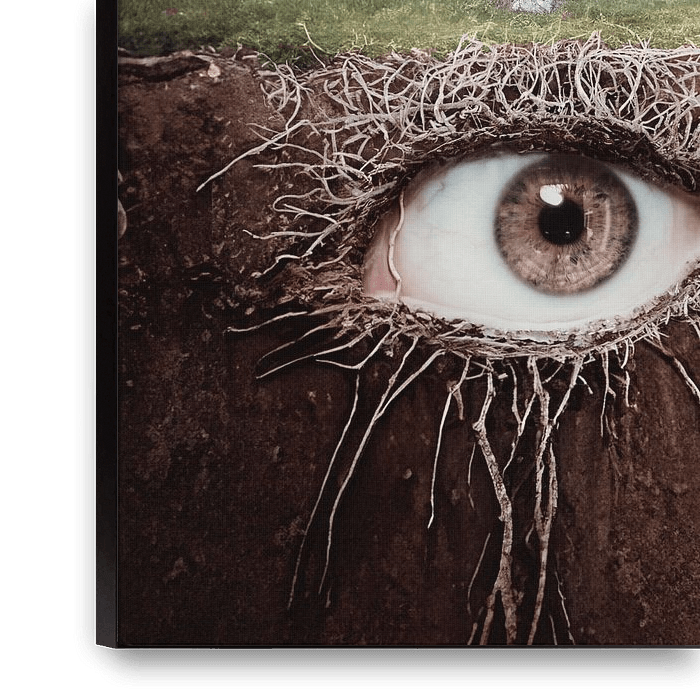Cependant, le véritable mystère de l'image se révèle sous terre, là où l'œil brun semble émerger de la terre. Caché parmi les racines de l'arbre, il dégage un sentiment d'émerveillement et de découverte. S'agit-il d'une créature de la terre elle-même, réveillée après un repos prolongé ? Ou est-ce une représentation métaphorique du caché, des forces invisibles qui nous entourent ?