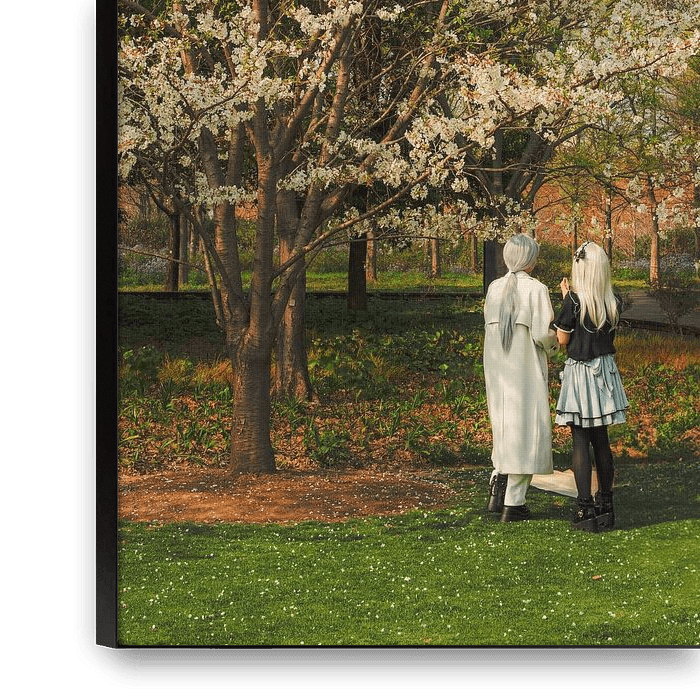 Cette image atmosphérique invite le spectateur à se plonger dans la beauté paisible d'un parc au printemps. Au centre de la scène se trouvent deux personnes qui flânent sous des cerisiers à la floraison luxuriante. Les fleurs blanches des sakura, le vert vif de la pelouse et le ciel bleu tendre créent un jeu de couleurs harmonieux qui…