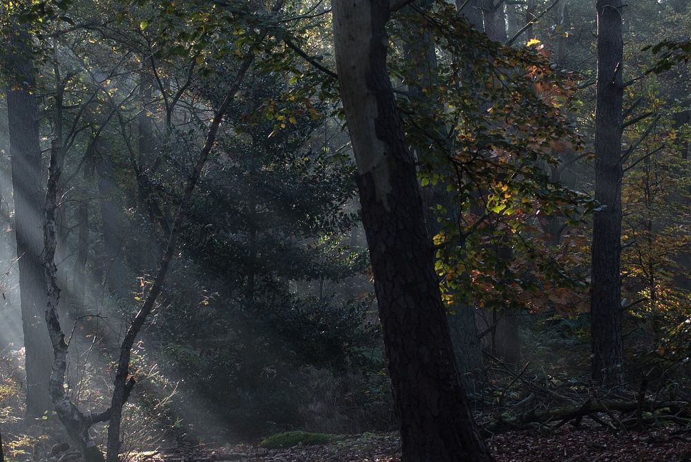 Au petit matin, on peut parfois apercevoir des harpes solaires qui s'élèvent jusqu'au sol à travers les arbres.
