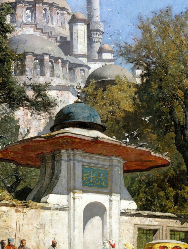 Une mosquée d'Alberto Pasini est une étonnante peinture orientaliste qui dépeint l'intérieur d'une mosquée dans ses moindres détails. La peinture présente des couleurs et des motifs riches, depuis les tuiles et les arcs ornés jusqu'aux motifs complexes du tapis et des textiles.
