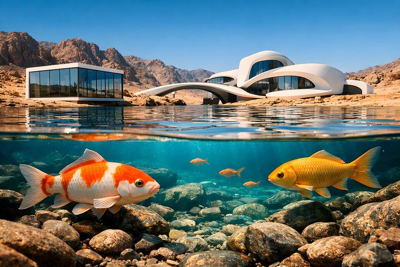 Cette œuvre d'art époustouflante présente une vue fascinante au-dessus et au-dessous de l'eau, qui capture l'union harmonieuse entre architecture futuriste et beauté naturelle. Au-dessus des eaux claires, des bâtiments modernes aux formes organiques s'élèvent dans un paysage montagneux aride, dégageant une esthétique à la fois luxueuse…