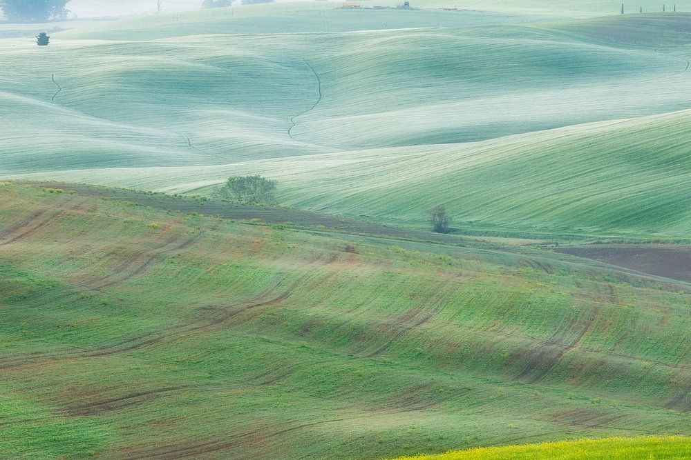 Une photo de paysage des collines vertes et brumeuses de la Toscane au printemps en Italie, avec de belles couches et une lumière douce.