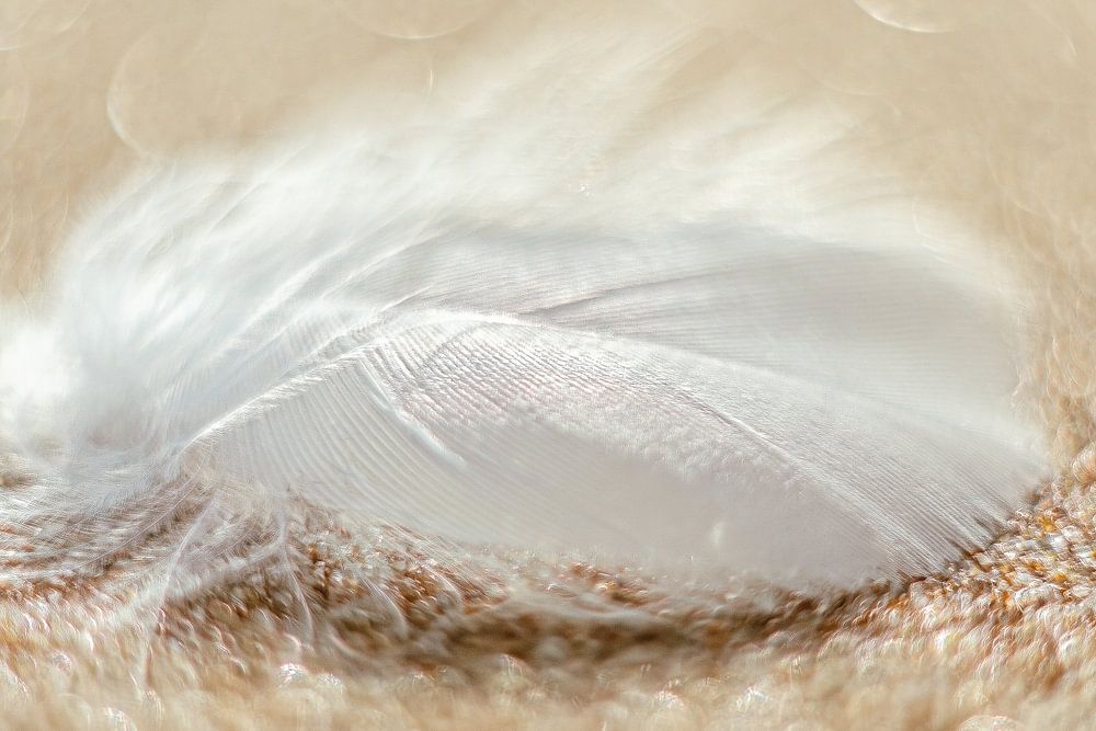Une plume sur la plage avec beaucoup de bokeh. Réalisé avec un objectif Helios vintage.