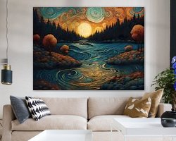 Art abstrait d'une rivière tourbillonnante dans un paysage de conte de fées, basé sur le travail de James R. Eads et le tableau de Van Gogh La nuit étoilée. Généré à l'aide de l'intelligence artificielle.